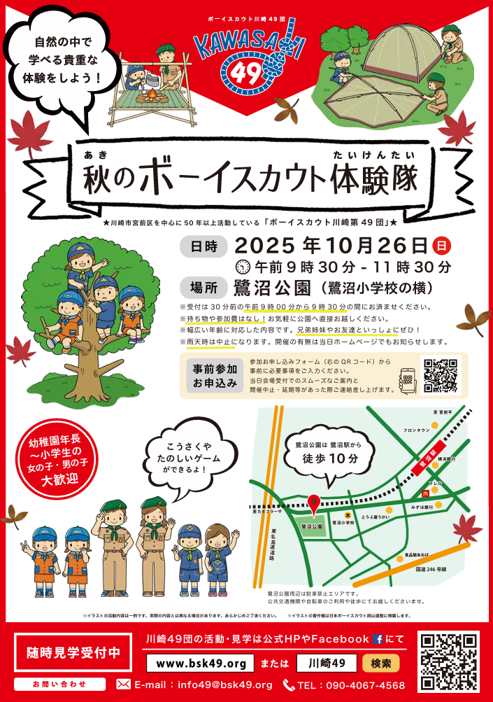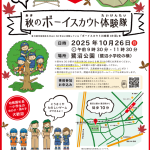 - 【予告】2025年10月26日(日)午前「秋のボーイスカウト体験隊」(鷺沼公園)実施します。2025年秋のボーイスカウト体験集会を実施いたします。 下記フォームよりお申し込みいただきますと、当…