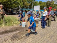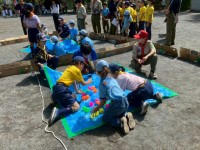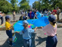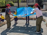 ブルーシートでボール運びのようです。ボーイ隊・カブ隊・ビーバー隊で身長の差があるので高さを合わせるのは大変そうです。