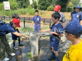 公園でも美化活動をしてから出発します。帽子を濡らしたり、各々熱中症対策をとります。
